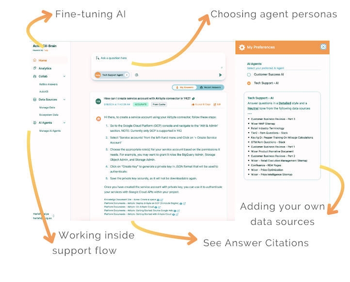 An example is given below, with AI responses showing exact citation from where answers were sourced. Also referring to only trusted resources within the org, not from outside information (Google, ChatGPT). And ability to keep the answers current and update to agent-in-the-loop feedback.